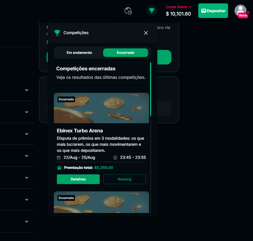 A Ebinex desenvolveu um sistema de competições que vai além do trading tradicional. Essencialmente, os campeonatos funcionam como torneios onde traders competem simultaneamente em diferentes categorias, criando assim múltiplas oportunidades de premiação.